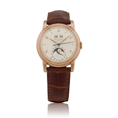 Une rarissime Patek Philippe calendrier perpétuel 2497. Sortie en 1951, cette référence compte moins de 180 exemplaires produits, ce qui la rend extrêmement précieuse et recherchée. L'exemplaire vendu par la maison Segre est un modèle de première série, le 7ème connu dans cette configuration spécifique. Son boîtier en or rose, associé à son cadran blanc, en fait un exemplaire particulièrement apprécié des collectionneurs pour son élégance et sa rareté.