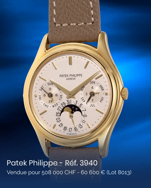 Lot : 8013 : La Patek Philippe Ref. 3940, lancée en 1985, est un quantième perpétuel automatique iconique avec un calibre ultra-fin 240Q. Cet exemplaire en or jaune de 1987, potentiellement transitoire entre deux séries, a été vendu HK$508,000
