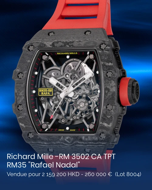Lot 8004 : La Richard Mille RM35-02 Rafael Nadal, lancée en 2016, allie innovation et légèreté avec un boîtier en Carbon TPT et un mouvement squelette ultra-résistant supportant jusqu'à 5,000 Gs. Inspirée par l’énergie du tennisman, cette montre d’exception a été vendue pour HK$2,159,000
