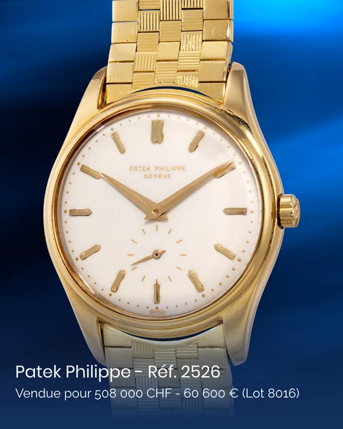 Lot 8016 : La Patek Philippe Ref. 2526, première montre-bracelet automatique de la marque, est un modèle historique doté du calibre 12-600 AT et d’un rare cadran émaillé. Cet exemplaire en or jaune de 1955 avec bracelet Gay Frères s’est vendu HK$508,000