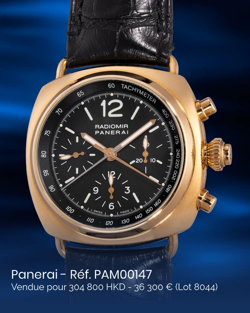 Lot 8044 : La Panerai Radiomir Chrono Split-Seconds Ref. PAM00147, produite en seulement 35 exemplaires, associe un boîtier en or rose de 42 mm à un rare mouvement Venus 185. Cet hommage aux chronographes militaires des années 1930 s’est vendu HK$304,800 soit deux fois son estimation haute.