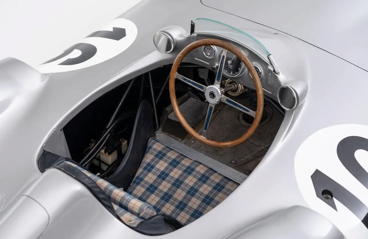 Mais cette voiture n’est pas un simple vestige du passé. Son châssis numéro 00009/54 renferme des souvenirs vibrants de vitesse et de gloire. Parmi les rares exemplaires dotés de la carrosserie profilée "Stromlinienwagen", ce bolide a porté en son cockpit les légendes Juan Manuel Fangio et Stirling Moss, Son premier rugissement en compétition remonte à janvier 1955, lors du Grand Prix de Buenos Aires. Ce jour-là, Fangio, maître incontesté de la piste, a offert à Mercedes une victoire éclatante, marquant le début d’une saison triomphale. Quelques mois plus tard, lui et Moss ont achevé l’année en beauté, décrochant respectivement la première et la deuxième place au championnat du monde de Formule 1.